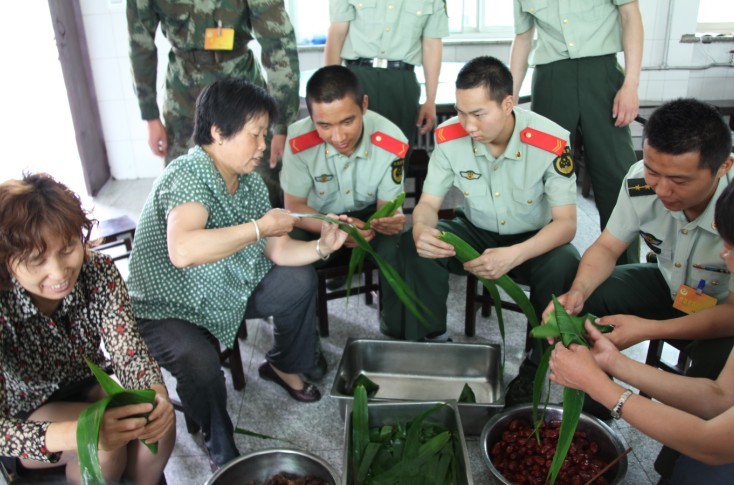 米粮山社区的阿姨、大姐们一边手把手地教战士们包粽子,一边与战士们聊家乡、聊生活,现场洋溢着欢乐祥和的气氛。社区居民冯红莲对记者说:“战士们离家远,又思念家乡,在这个传统的节日里,希望他们能尝到我们亲手包的粽子,感受到节日的温暖和快乐。”